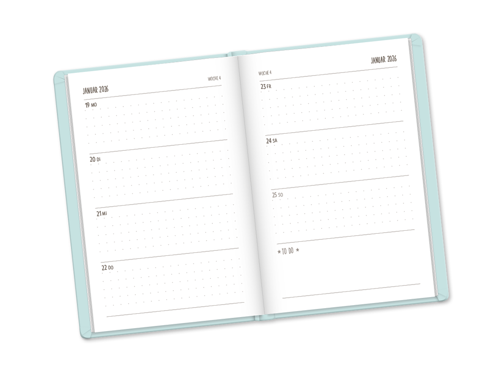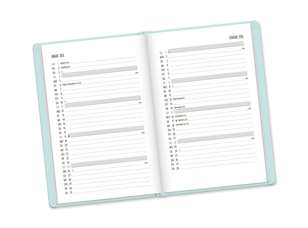 Diese Variante ist ein eleganter Begleiter durch das Jahr. Das edle Softcover im Lederlook ist fühlbar hochwertig verarbeitet und besonders unempfindlich. Filigran geprägte Ornamente zieren das Cover des attraktiven Terminplaners. Jede Kalenderwoche ist übersichtlich auf einer Doppelseite dargestellt. Außerdem bietet der Timer Platz für Notizen und all das, was Dir wichtig erscheint.
