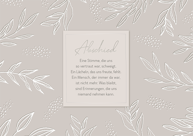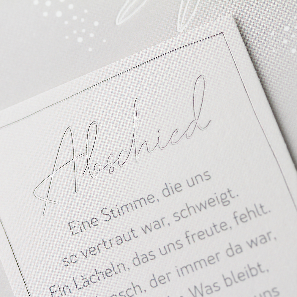 Auf einfühlsame Weise Trost spenden und Anteil nehmen. Unsere Trauer Karten drücken mit liebevoll gewählten Worten, einer dezenten Gestaltung, filigranen Illustrationen und besonderen Veredelungen aufrichtiges Mitgefühl aus.
