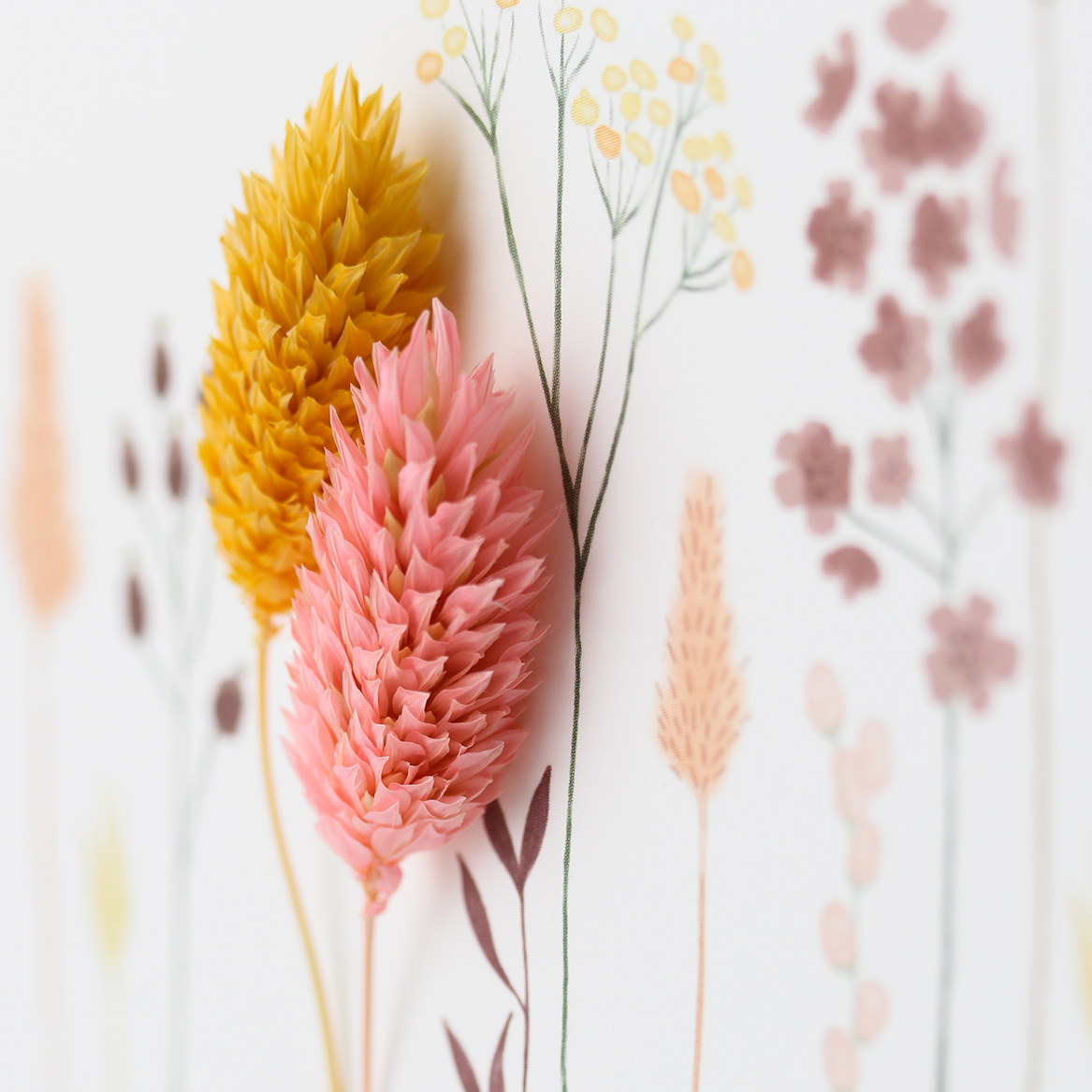 Von Hand eingesteckte Trockenblumen verschmelzen mit schönsten Watercolor-Designs zu kleinen Kunstwerken.