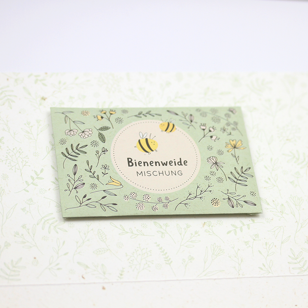 Diese Grußkarte zaubert nicht nur lieben Menschen ein Lächeln ins Gesicht, sondern auch Bienen und anderen Insekten. In der Innenseite der Karte befindet sich eingeklebt ein Tütchen mit einer Bienenweide-Mischung, die auf Balkon oder im Garten ausgesät werden kann.