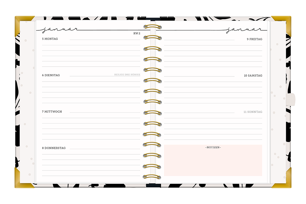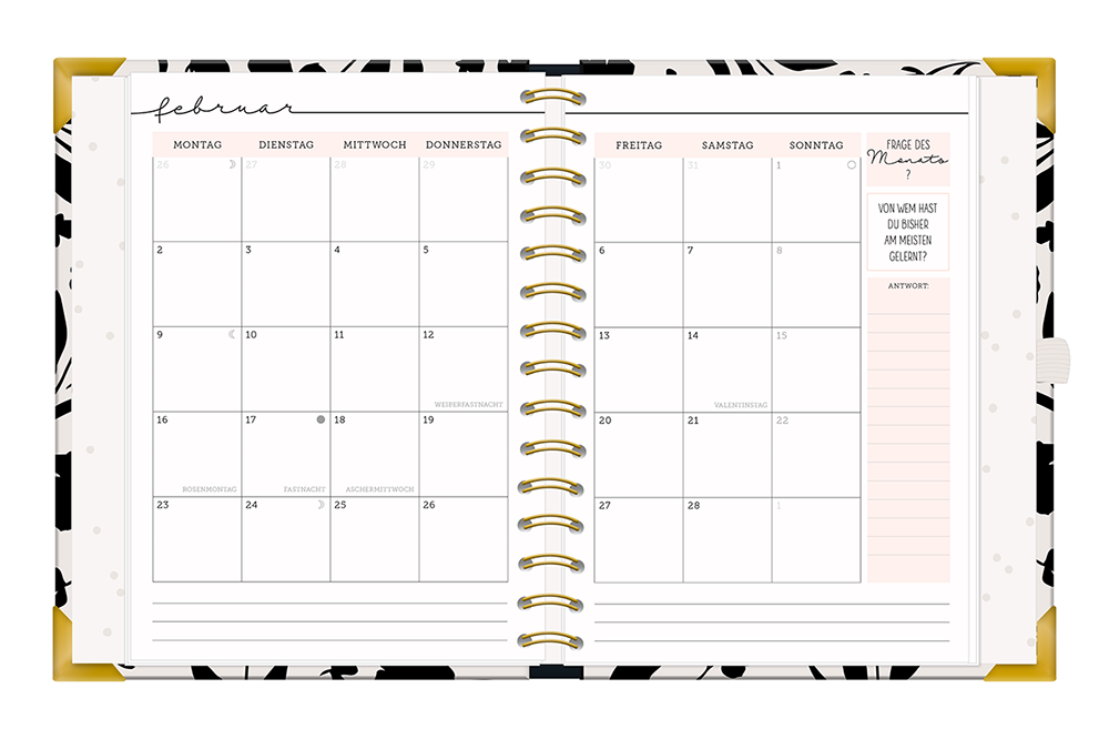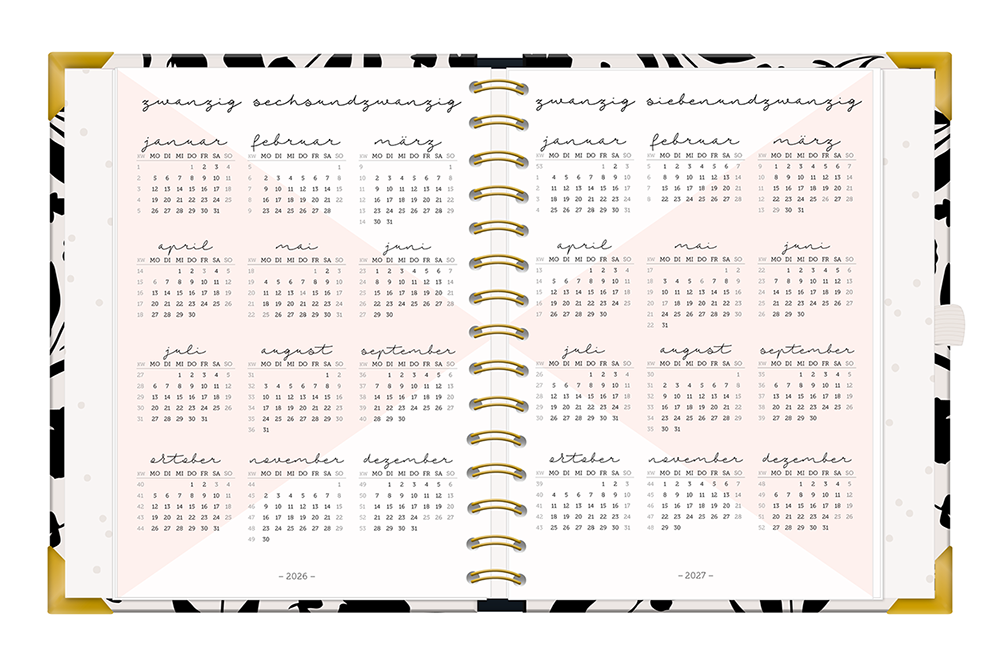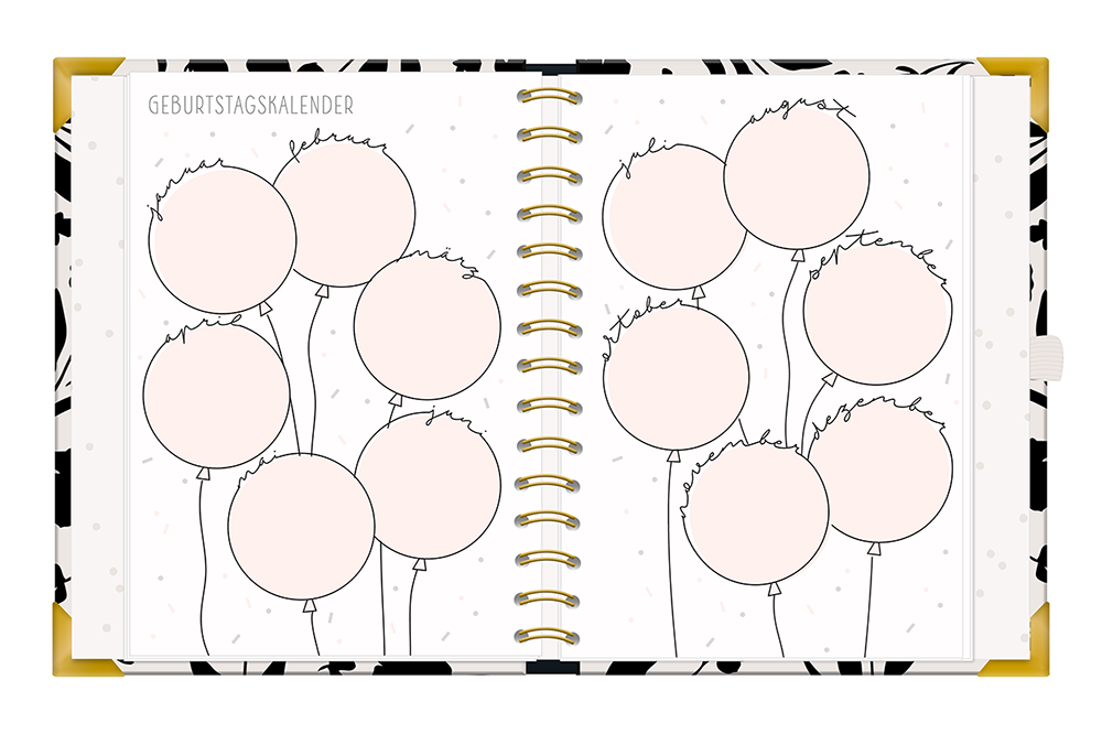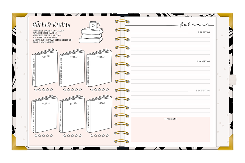 | Extraseiten im hinteren Teil: Tages-To-dos, To-do-Listen, Geburtstagskalender, Notizseiten + Rezeptseiten | |