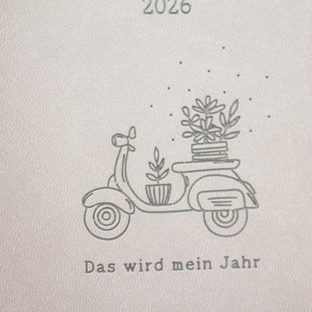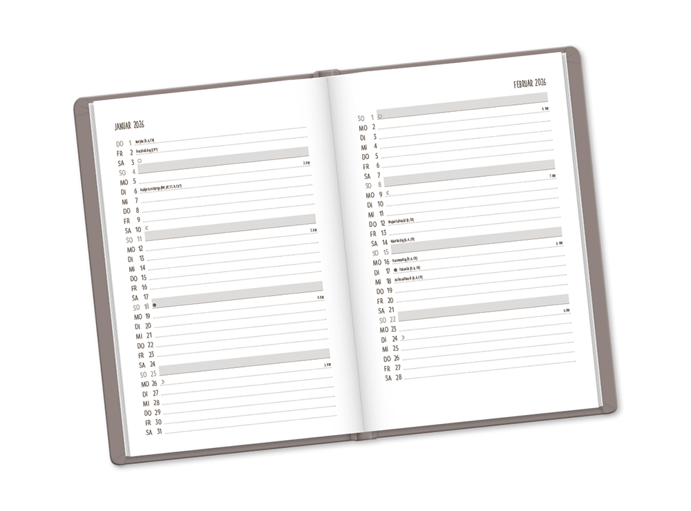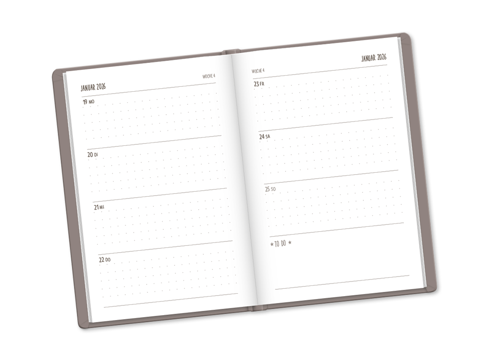 Diese Variante ist ein eleganter Begleiter durch das Jahr. Das edle Softcover im Lederlook ist fühlbar hochwertig verarbeitet und besonders unempfindlich. Filigran geprägte Ornamente zieren das Cover des attraktiven Terminplaners. Jede Kalenderwoche ist übersichtlich auf einer Doppelseite dargestellt. Außerdem bietet der Timer Platz für Notizen und all das, was Dir wichtig erscheint.