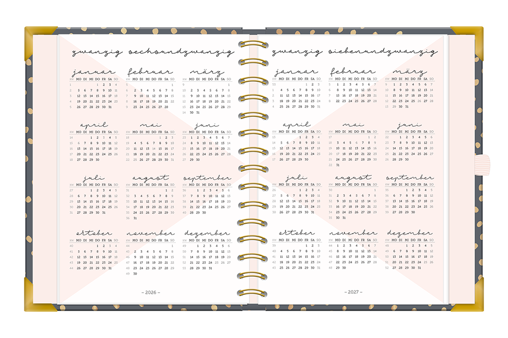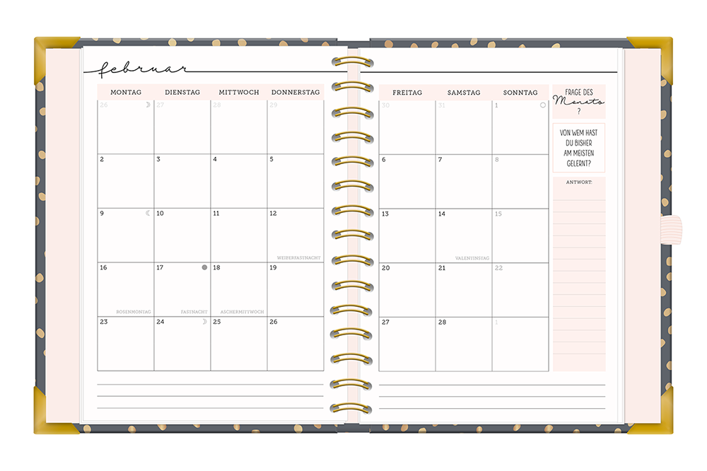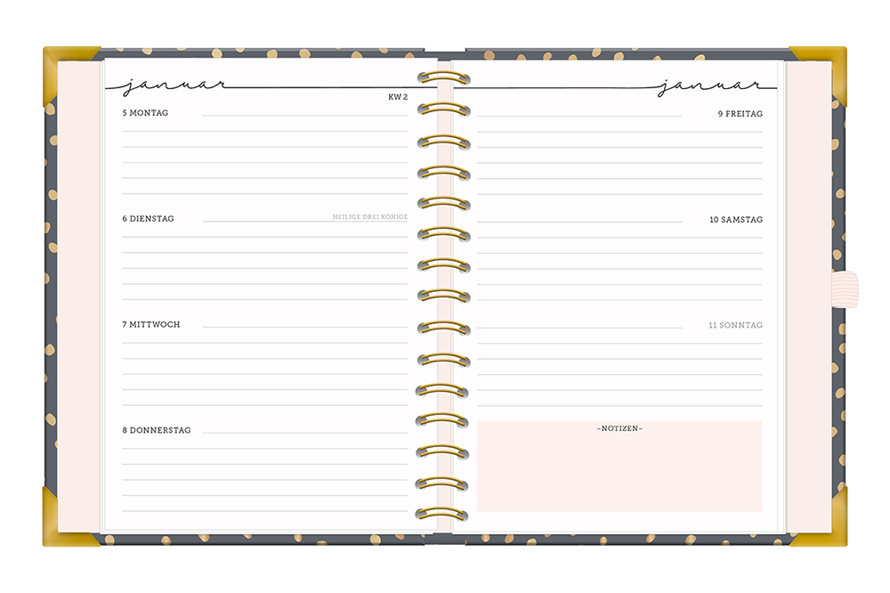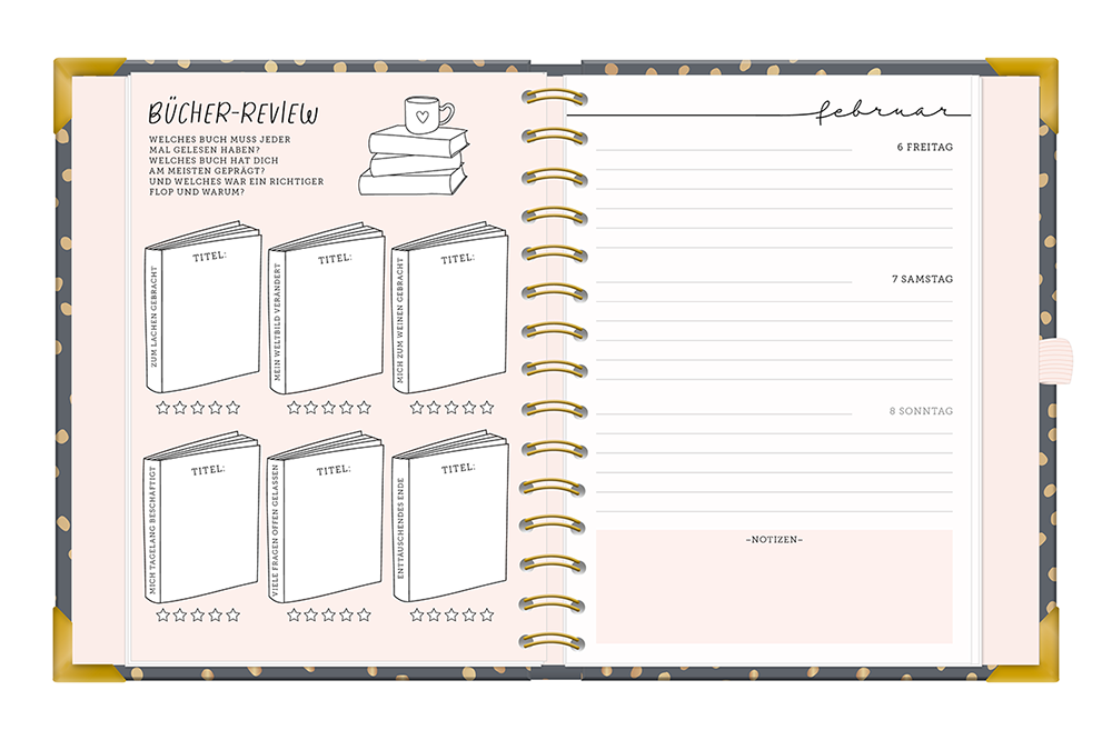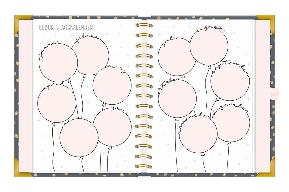 | Extraseiten im hinteren Teil: Tages-To-dos, To-do-Listen, Geburtstagskalender, Notizseiten + Rezeptseiten | |