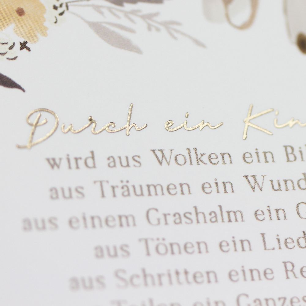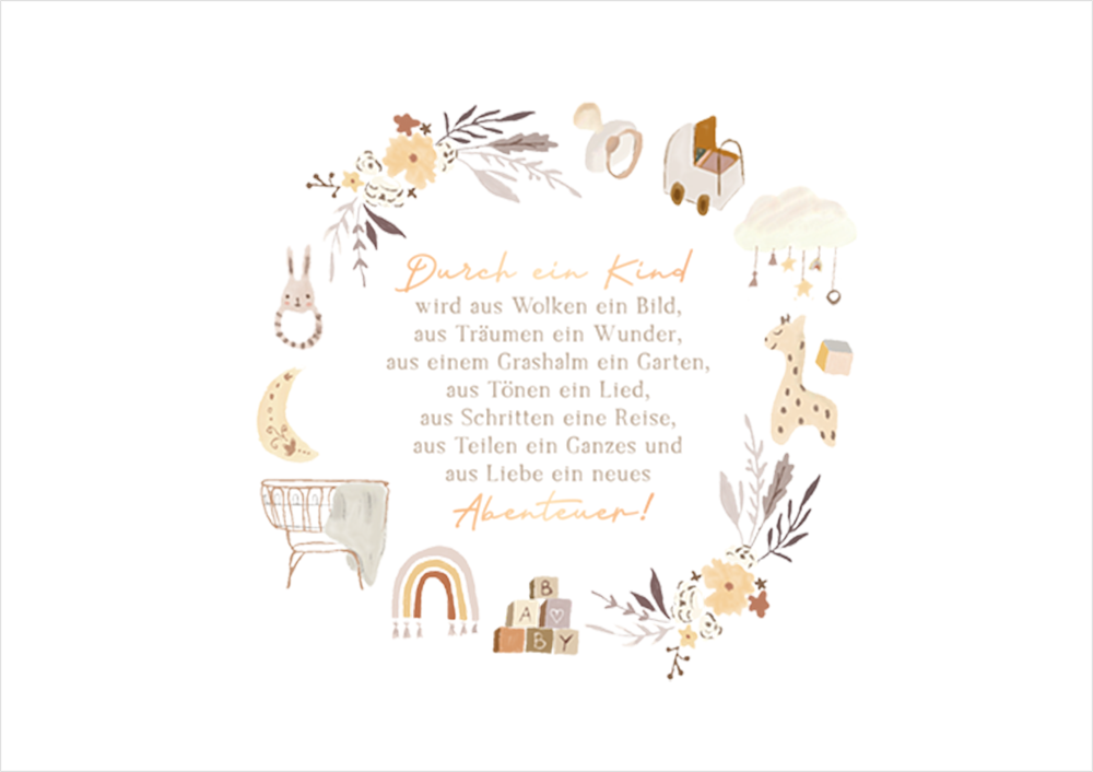 Durch ein Kind wird aus Wolken ein Bild, aus Träumen ein Wunder, aus einem Grashalm ein Garten, aus Tönen ein Lied, aus Schritten eine Reise, aus Teilen ein Ganzes und aus Liebe ein neues Abenteuer!