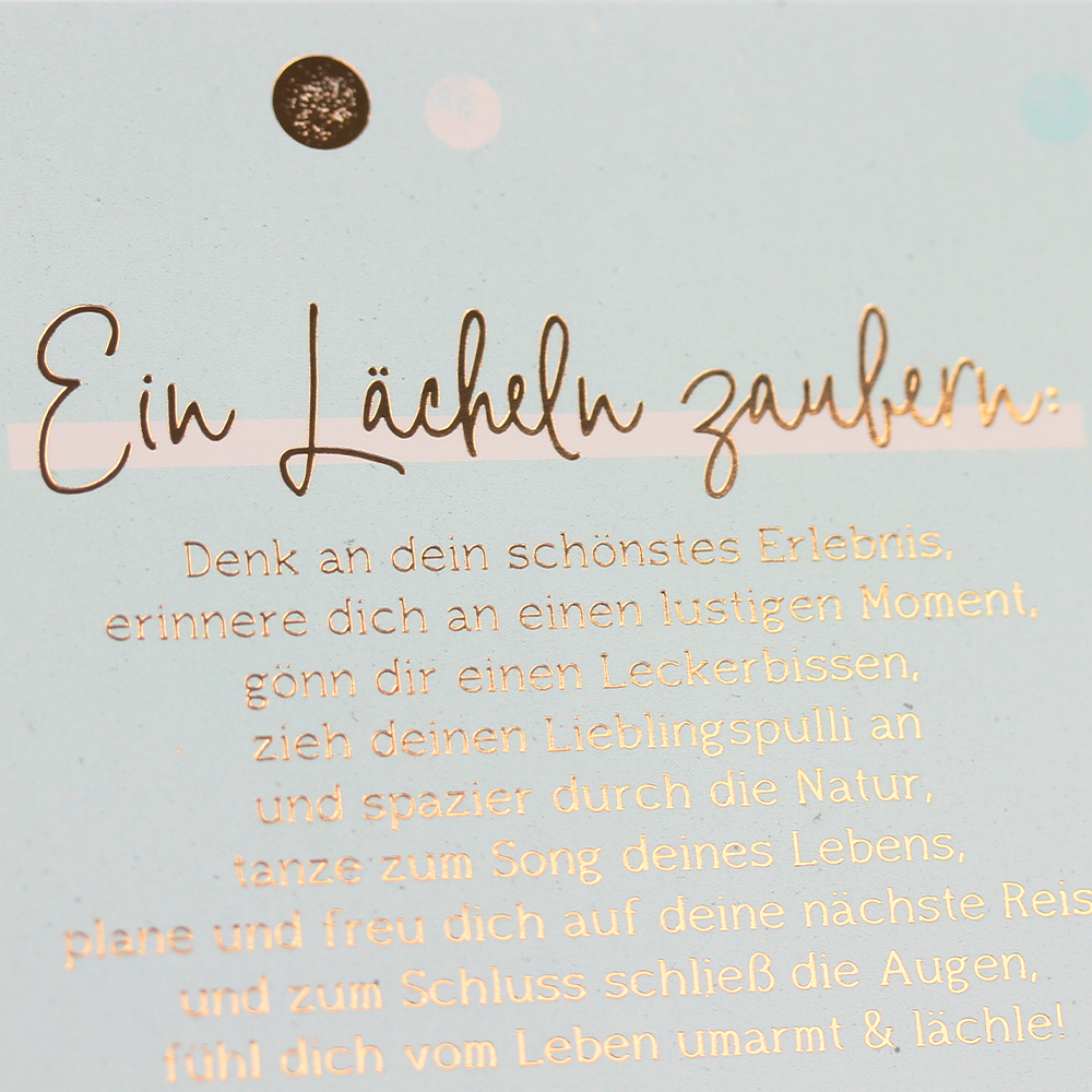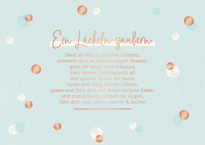 Dank an dein schönstes Erlebnis, erinnere dich an einen lustigen Moment, gönn dir einen Leckerbissen, zieh' deinen Lieblingspulli an und spazier durch die Natur, tanze zum Song deines Lebens, plane und freu dich auf deine nächste Reise, und zum Schluss schließ die Augen, fühl dich vom Leben umarmt & lächle!