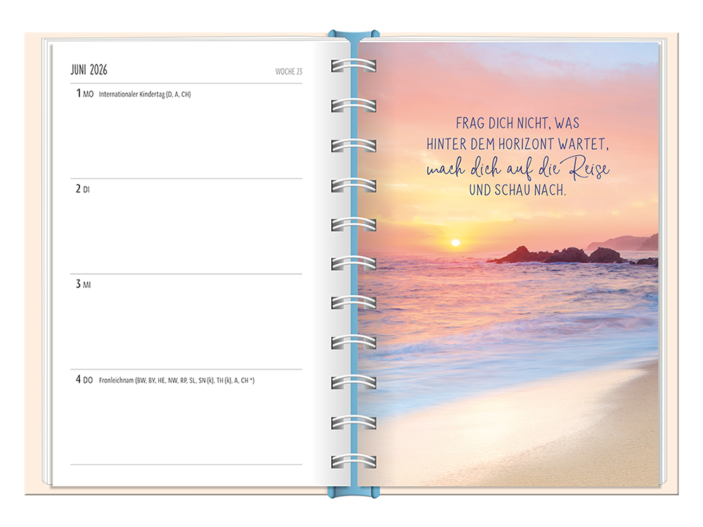 stabiler Hardcover-Umschlag, Verschlussgummi, Lesezeichen-Bändchen aus Satin und 12 farbenfrohe Grafik Werkstatt-Motive. Jede Kalenderwoche wird übersichtlich auf einer Doppelseite dargestellt. Alle Terminplaner (außer den Timern in Lederoptik) beginnen den jeweiligen Monat mit einem Postkartenmotiv. Zusätzlich verfügt der Planer über eine Falttasche, in der 3 einzelne Postkarten enthalten sind. Im hinteren Teil des Terminplaners haben Sie Platz für Ihre Notizen.
