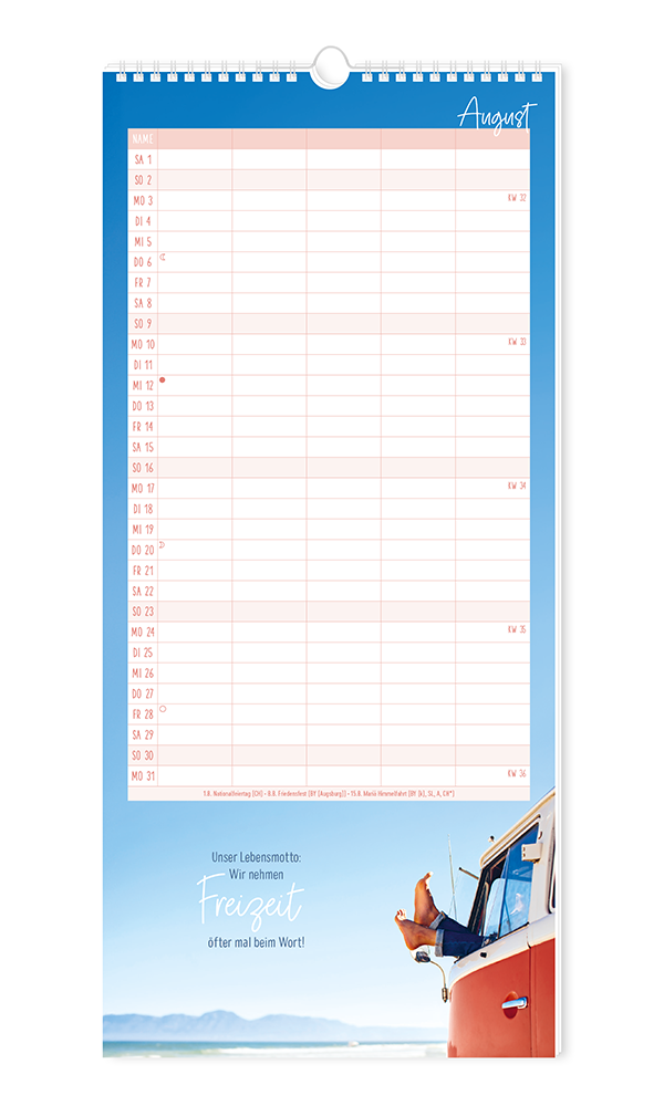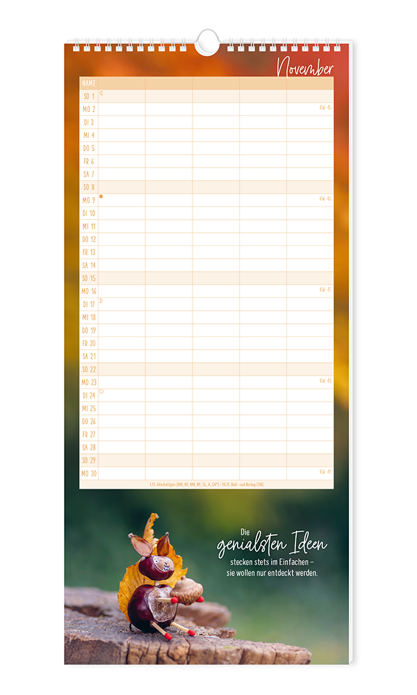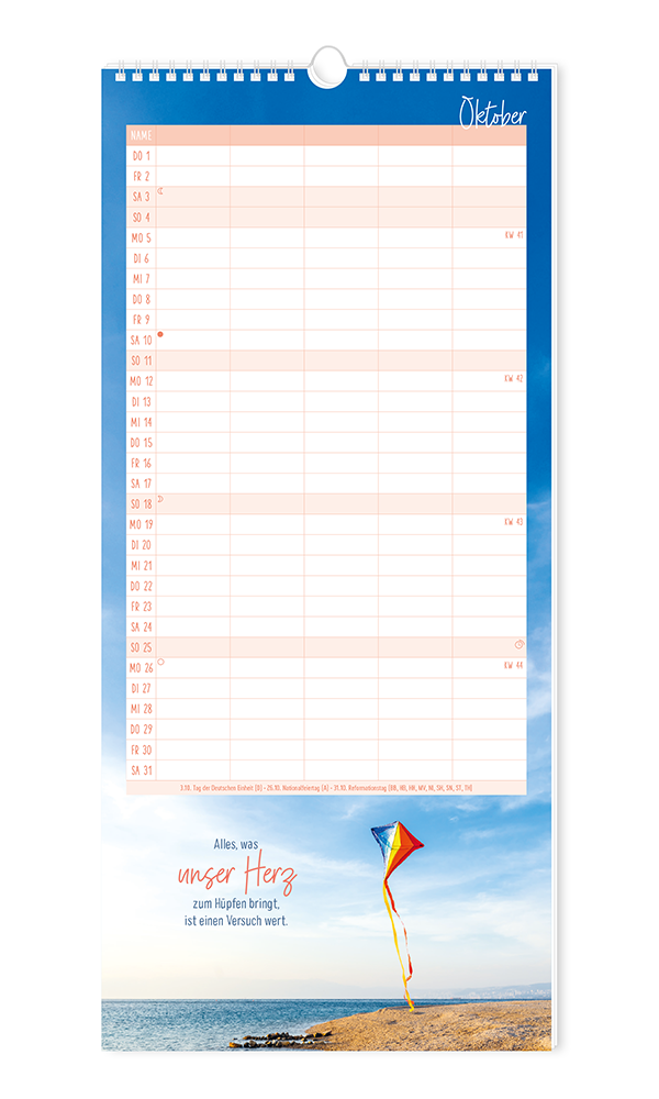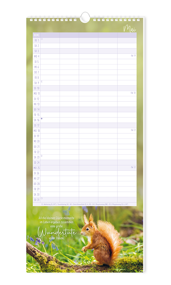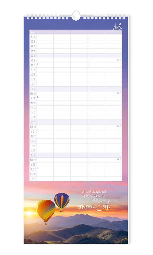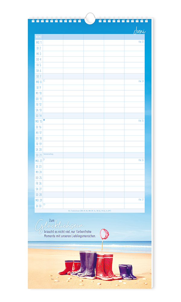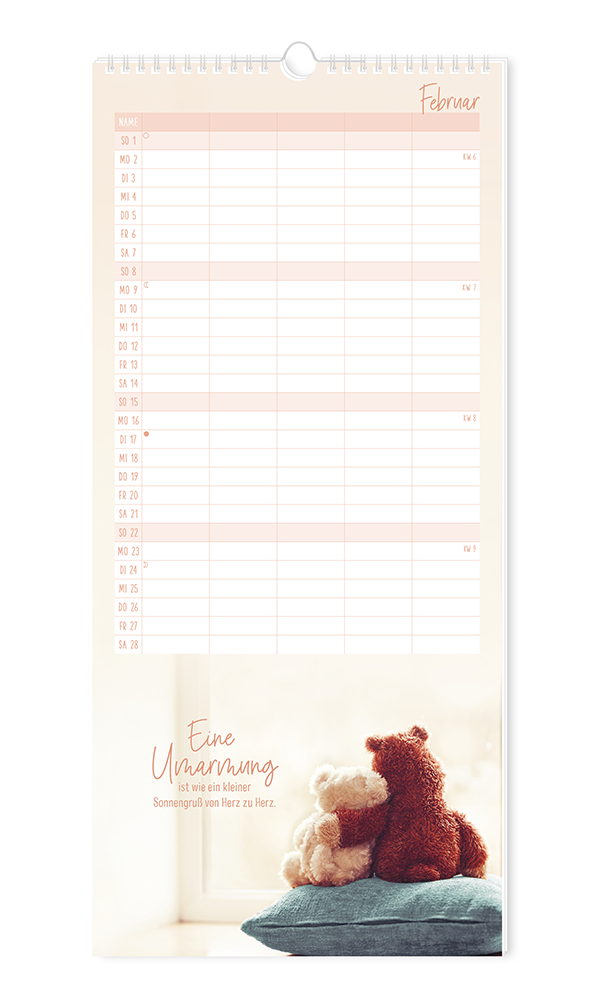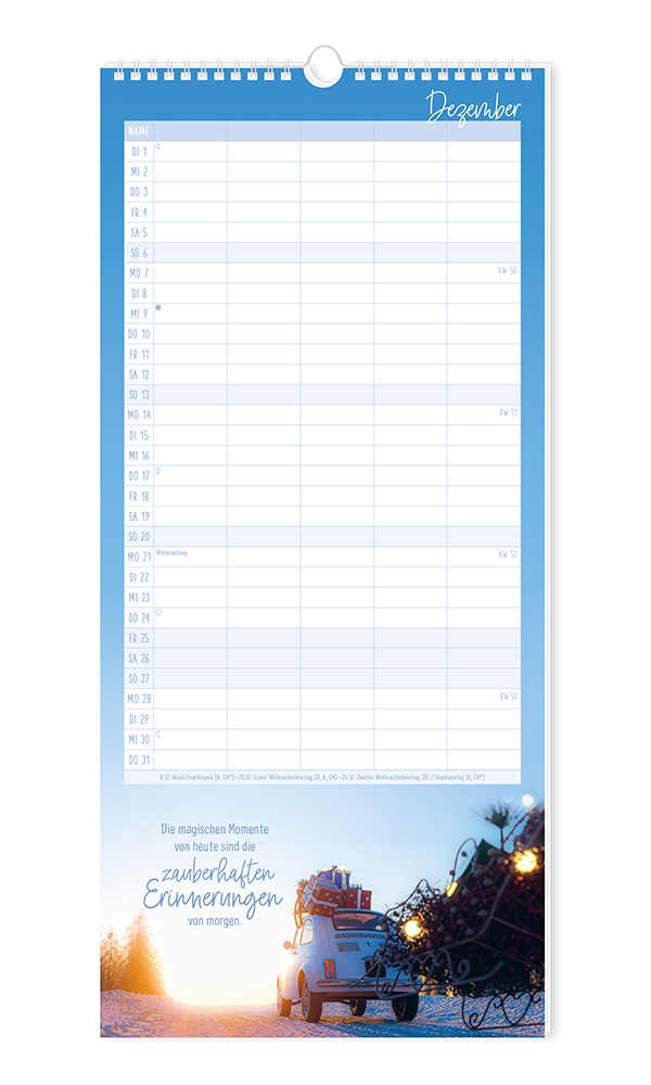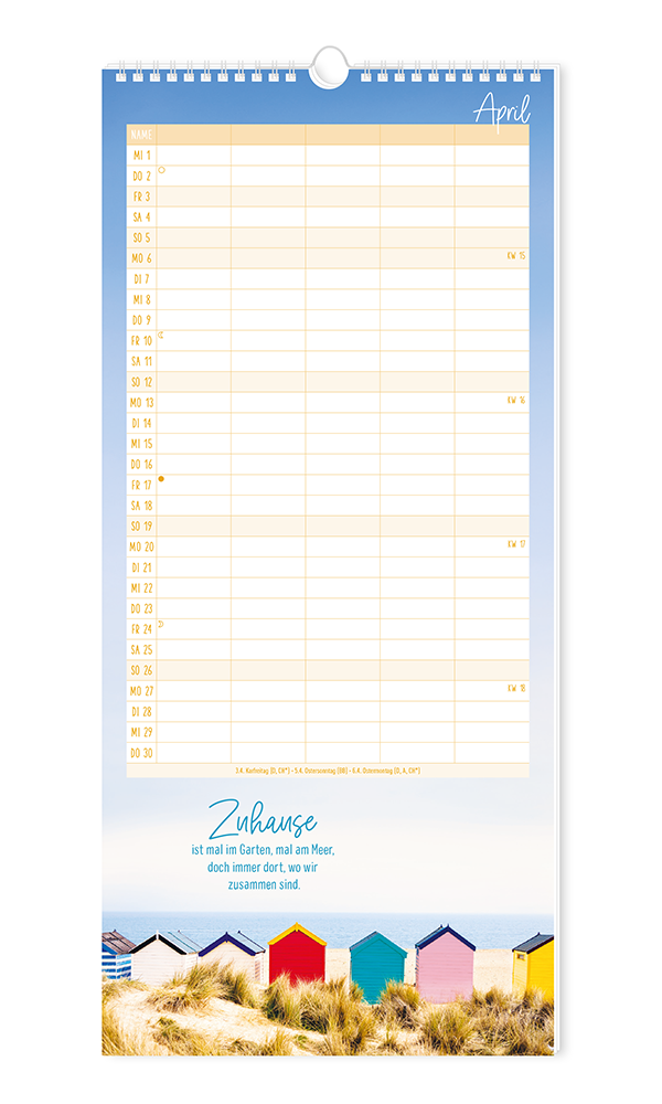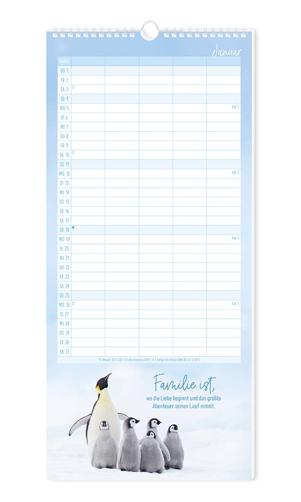 Unser bewährter Familienplaner bietet Platz für viele Einträge von allen Familienmitgliedern. Stimmungsvolle Motive runden das harmonische Erscheinungsbild ab. Terminkoordinierung leicht gemacht - für bis zu 5 Personen.