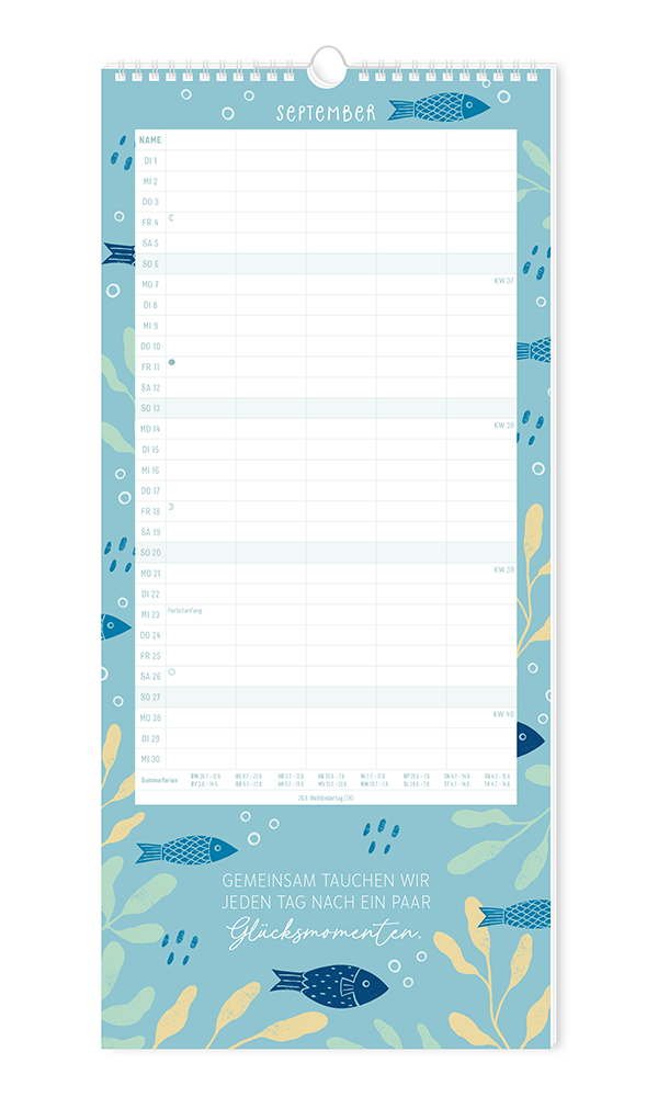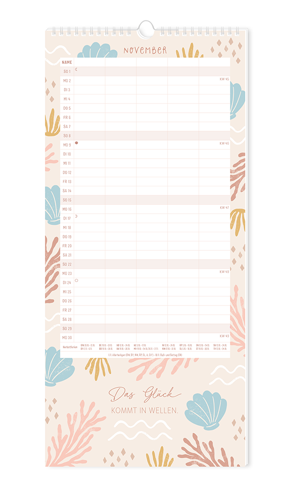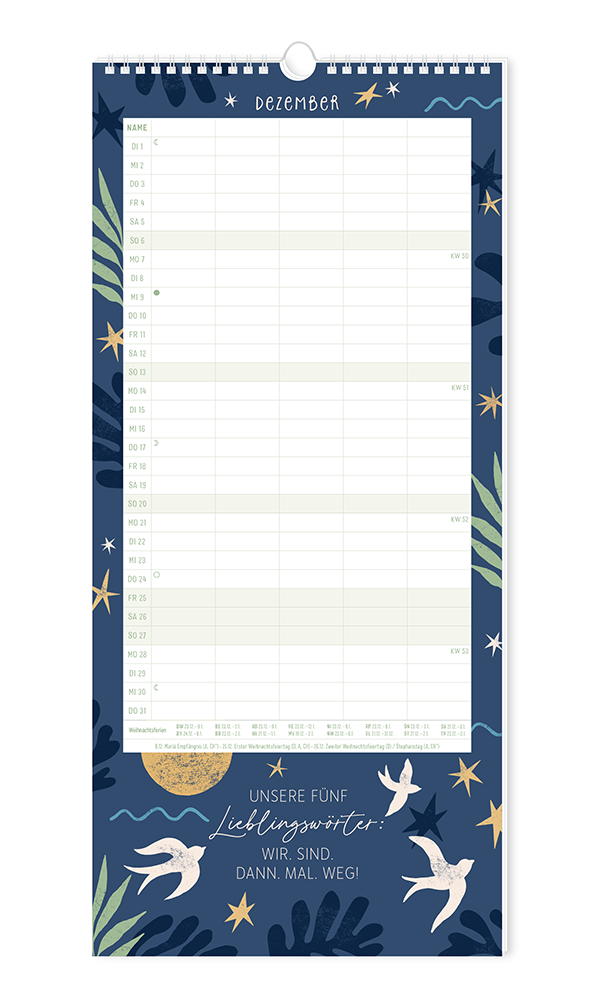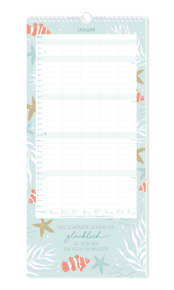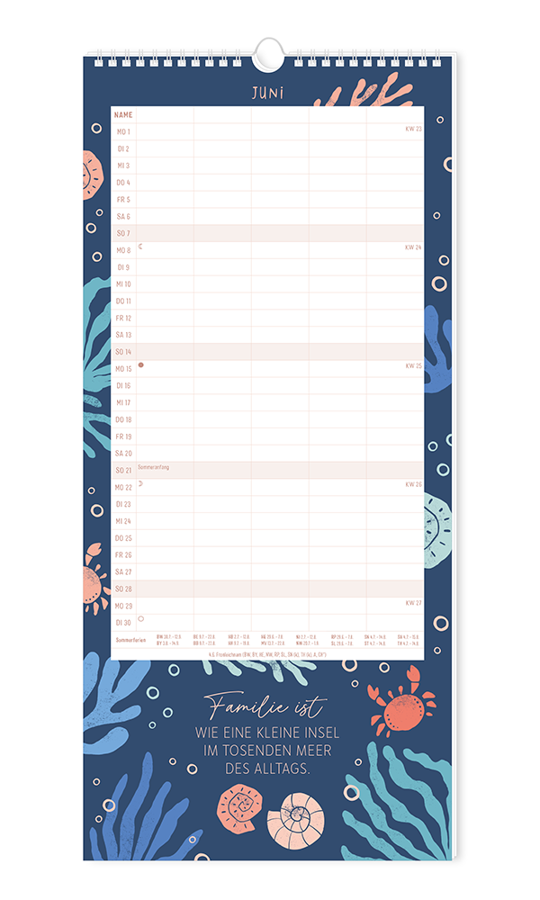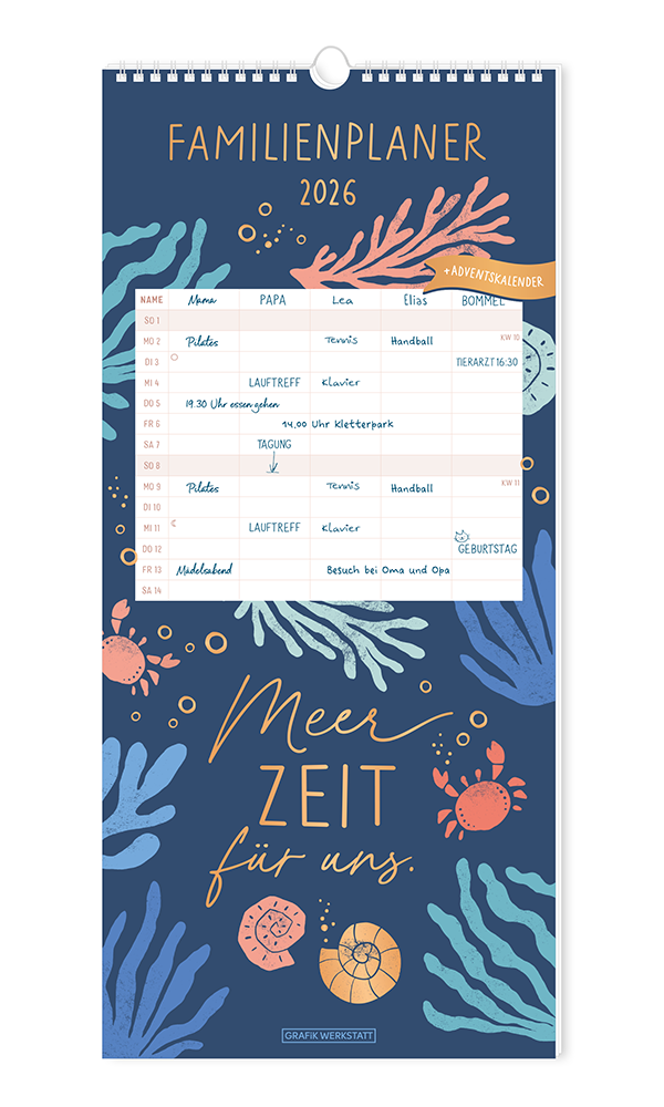 Unser bewährter Familienplaner bietet Platz für viele Einträge von allen Familienmitgliedern. Stimmungsvolle Motive runden das harmonische Erscheinungsbild ab. Terminkoordinierung leicht gemacht - für bis zu 5 Personen.