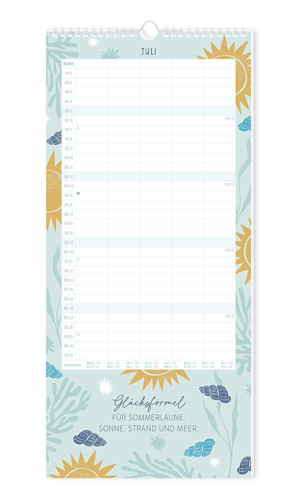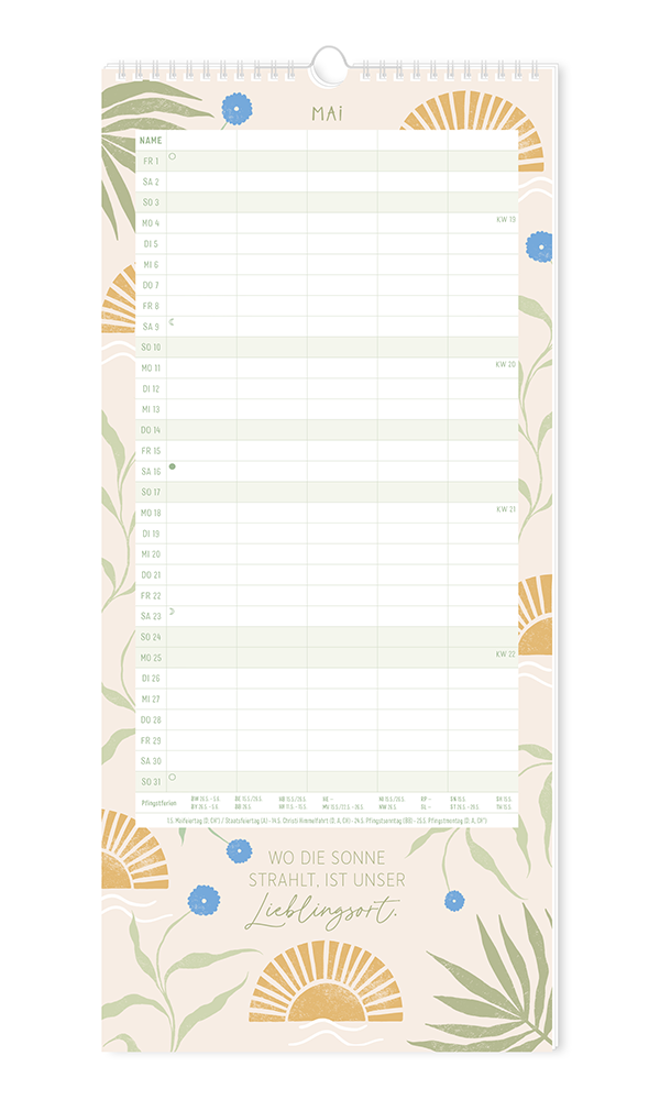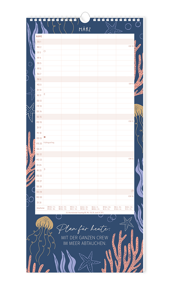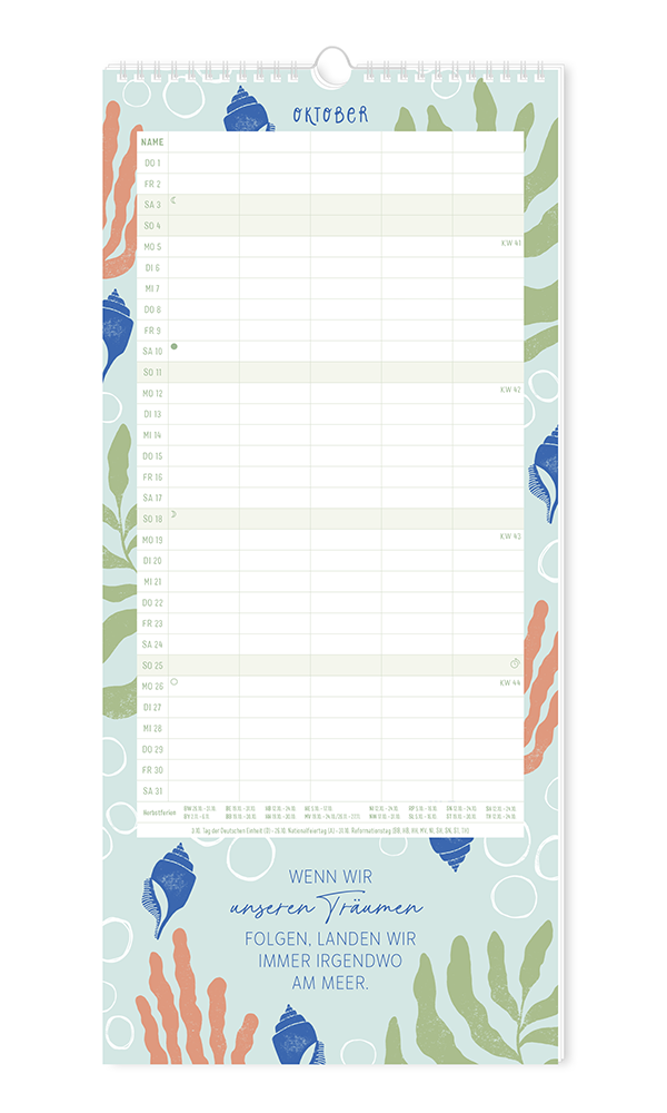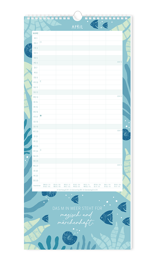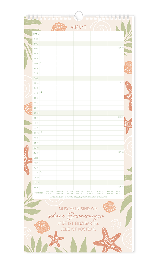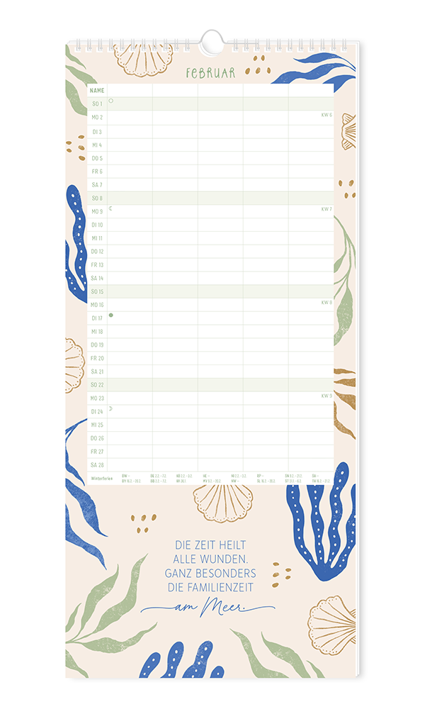 Unser bewährter Familienplaner bietet Platz für viele Einträge von allen Familienmitgliedern. Stimmungsvolle Motive runden das harmonische Erscheinungsbild ab. Terminkoordinierung leicht gemacht - für bis zu 5 Personen.