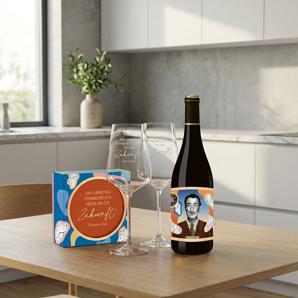 Stilvolles 4-teiliges Wein-Set – Enthält zwei Rotweingläser, eine Flasche Merlot 2023 aus Frankreich und ein 6-teiliges Korkuntersetzer-Set – alle Artikel mit dem inspirierenden Salvador Dalí-Design.