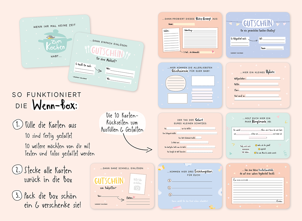 Wenn euch mal die Schlaflieder ausgehen, die Augen zufallen oder der Wickelmut verlässt, findet ihr in diesem selbgestalteten Karten-Set Tipps & Tricks für alle Baby-Fälle!
