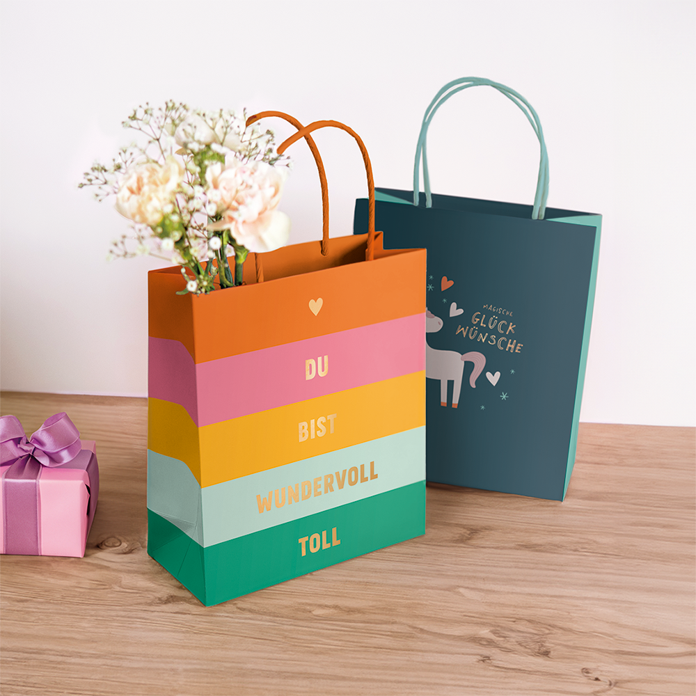 Stilvoll, praktisch, farbenfroh: Die attraktiven Geschenktüten aus festem Premium-Papier sind beidseitig mit Gold veredelt und werten all eure Präsente auf. Kleine Eyecatcher, die großartig was hermachen.