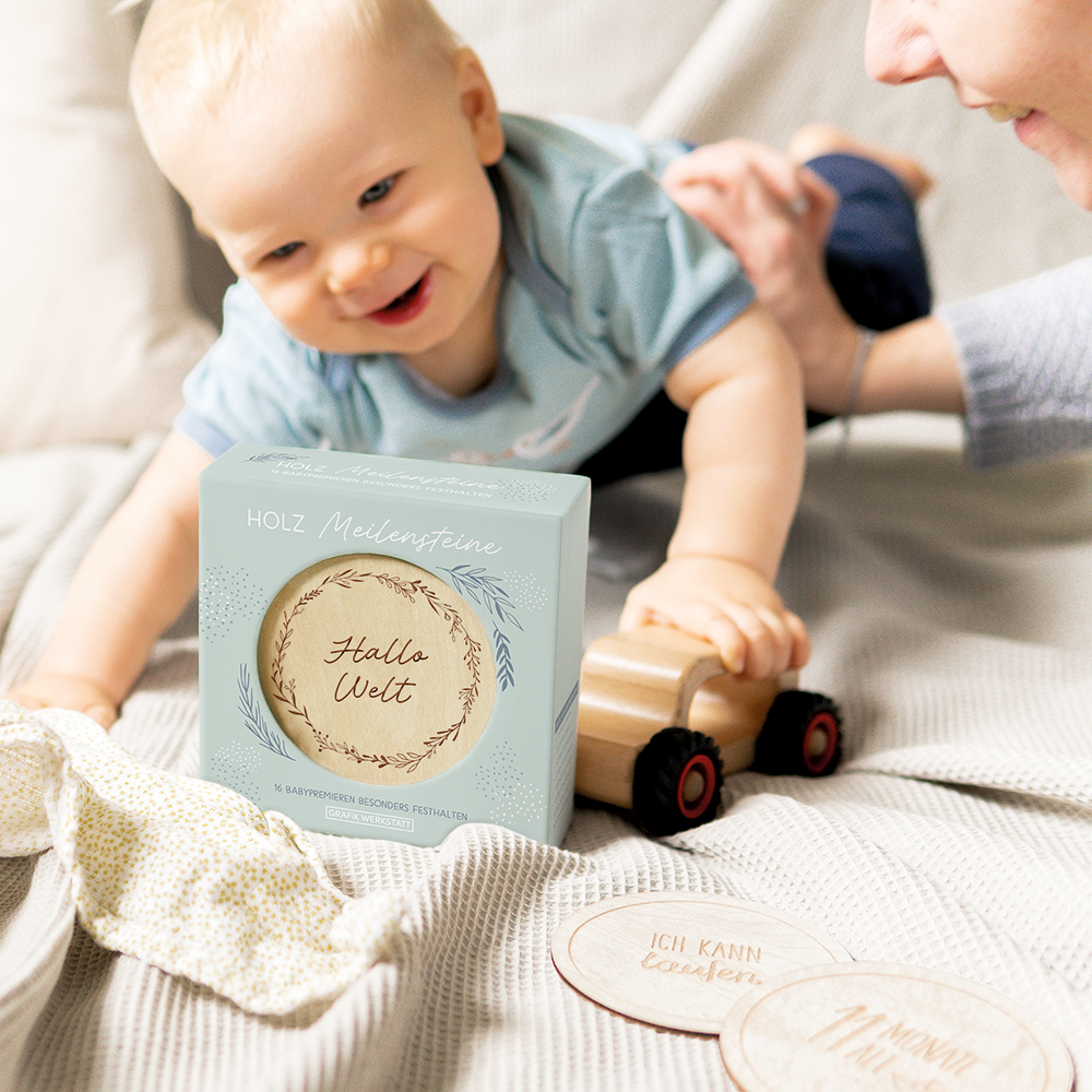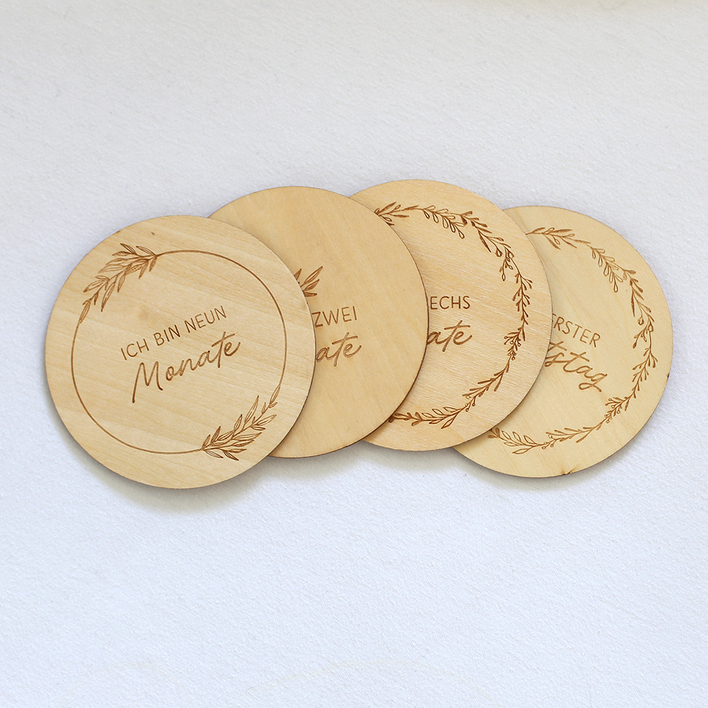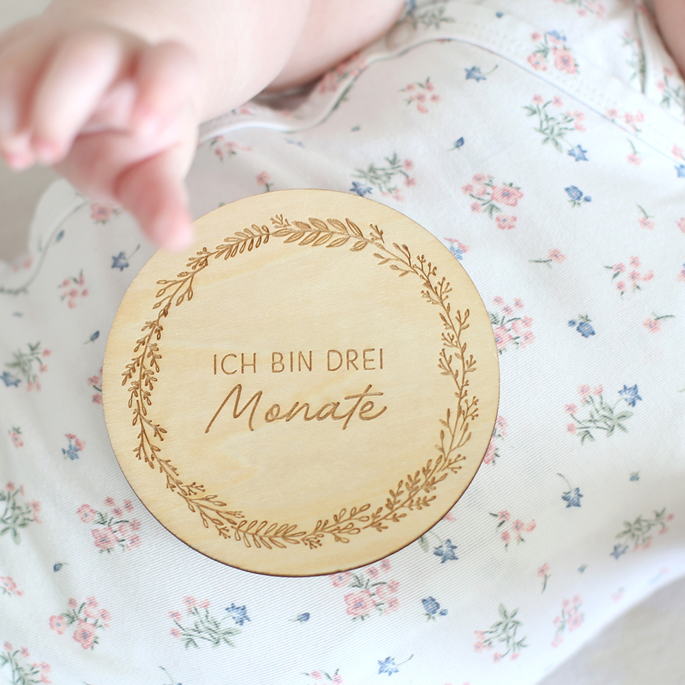 Jedes Baby ist ein kleines Wunder, jeder Lebensmonat besonders, jeder Tag ein neues Abenteuer - mit diesen Filigran gravierten Holzscheiben lassen sich Babys Premieren und Lebensmonate herzallerliebst festhalten: Einfach die passende Holzscheibe zum Baby legen, ein Foto knipsen und besondere Erinnerungen sammeln.
