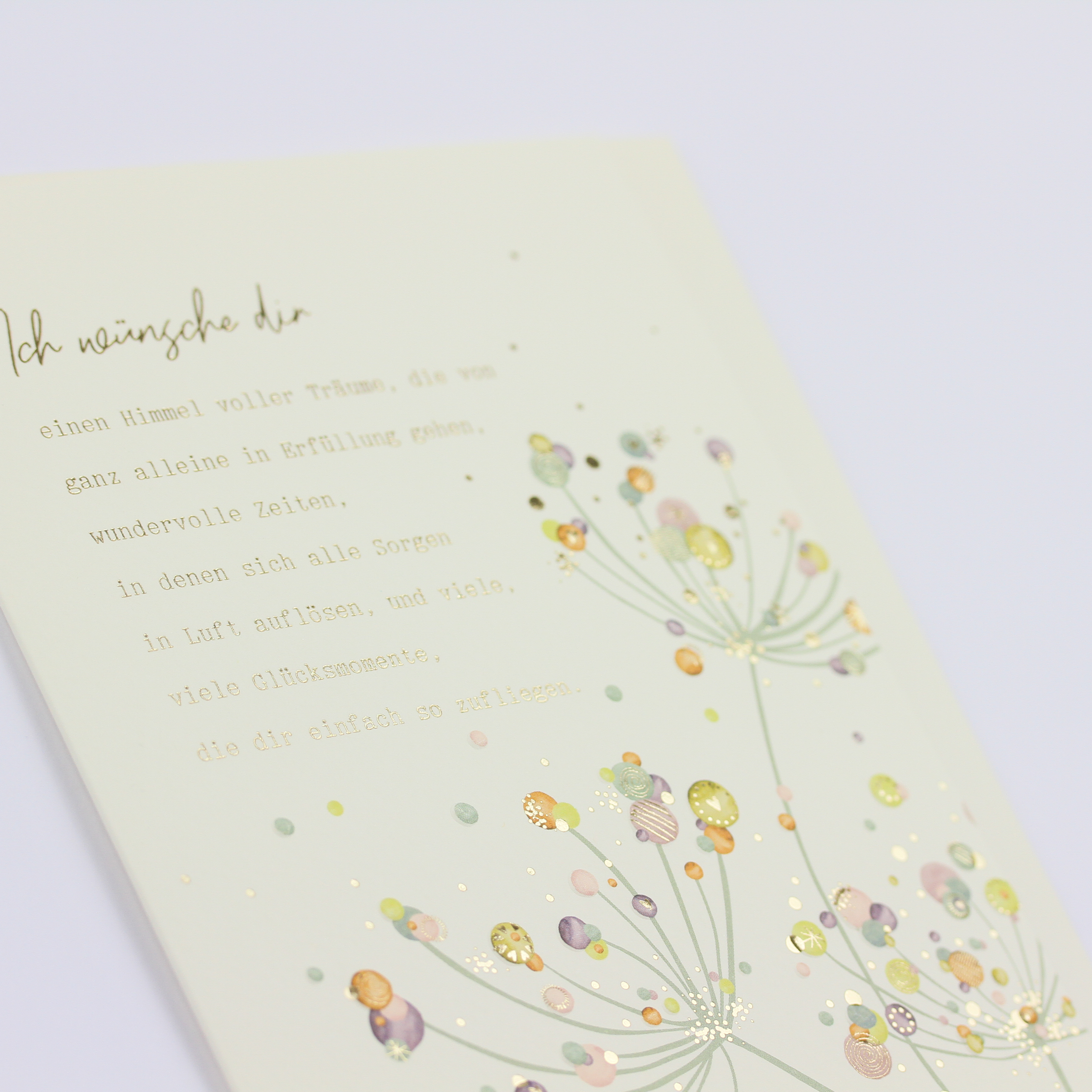 Ich wünsche dir einen Himmel voller Träume, die von ganz alleine in Erfüllung gehen, wundervolle Zeiten, in denen sich alle Sorgen in Luft auflösen, und viele, viele Glücksmomente, die dir einfach so zufliegen.