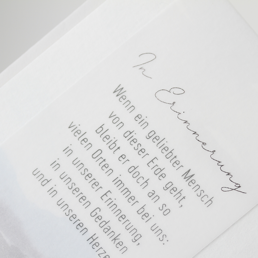Auf einfühlsame Weise Trost spenden und Anteil nehmen. Unsere Trauer Karten drücken mit liebevoll gewählten Worten, einer dezenten Gestaltung, filigranen Illustrationen und besonderen Veredelungen aufrichtiges Mitgefühl aus.