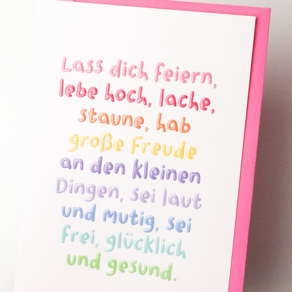 Lass dich feiern, lebe hoch, lache, staune, hab große Freude an den kleinen Dinge, sei laut und mutig, sei frei, glücklich und gesund.