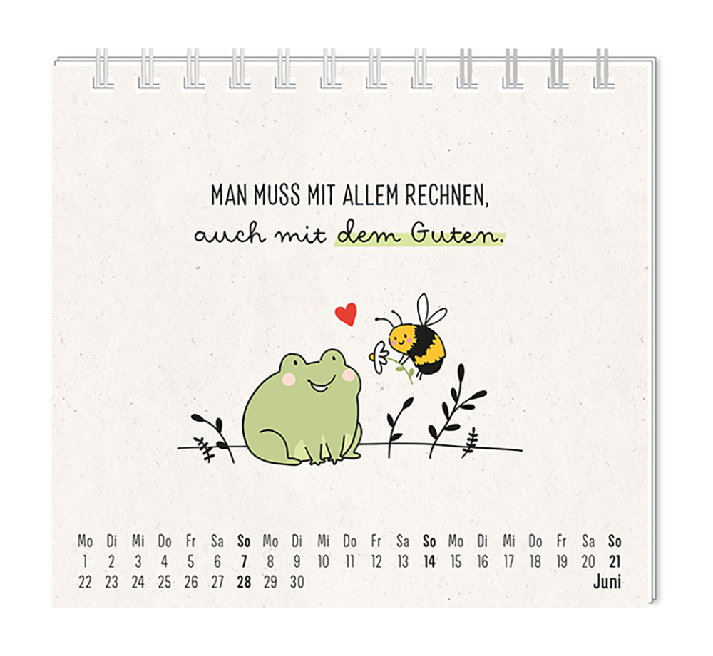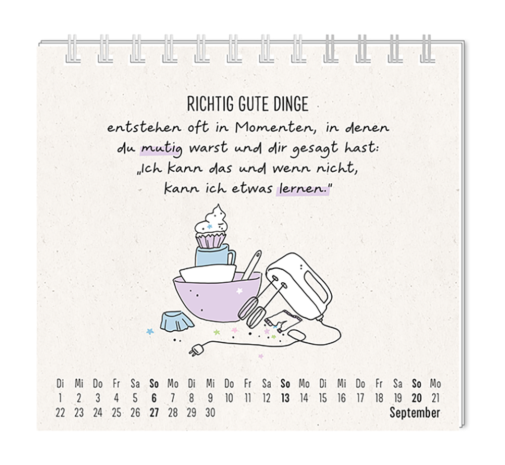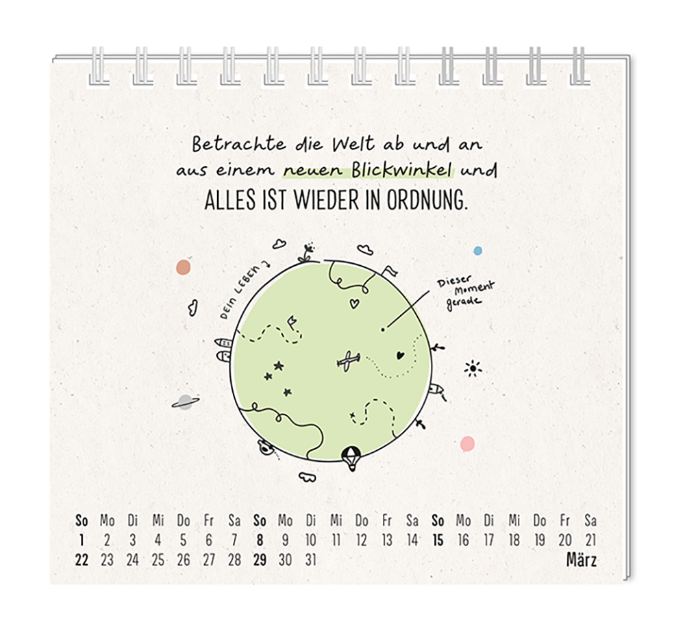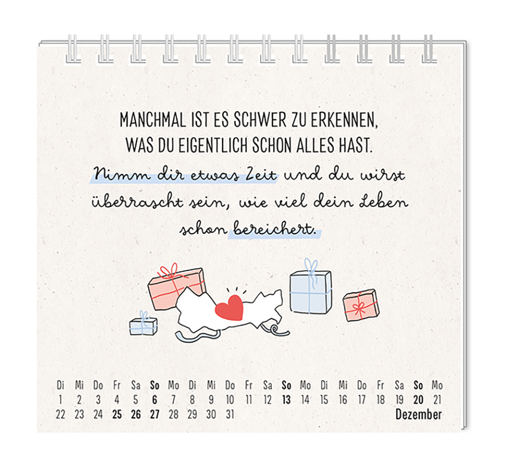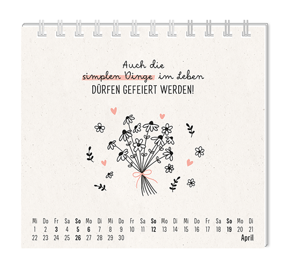 Dieser kleine Tischkalender, versprüht Monat für Monat ganz viel Lebens- und Farbenfreude. Ob Vintage oder Wortschätzchen – jeder von unseren Mini-Kalender schenkt eine Extraportion Glück. Inklusive einer Jahresübersicht und der wichtigsten Feier- und Festtage.