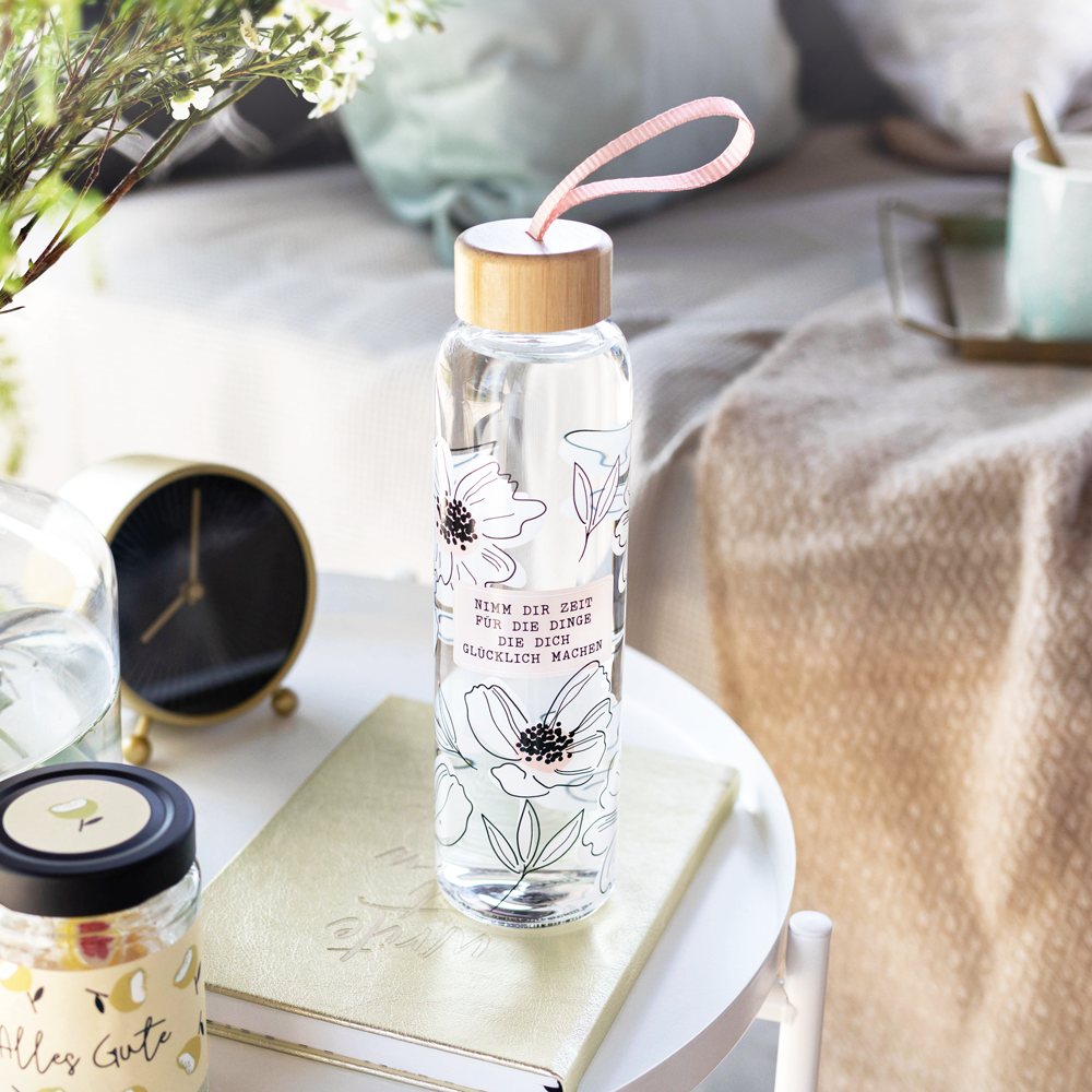 Die praktische Trinkflasche für unterwegs, beim Sport oder im Büro. Das liebevoll gestaltete Design macht dich und deinen neuen Begleiter zum echten Hingucker. So wird dein tägliches Wasser trinken zum stylischen Highlight und du bist durch die Benutzung der wiederverwendbaren Glasflasche freundlich zur Umwelt!