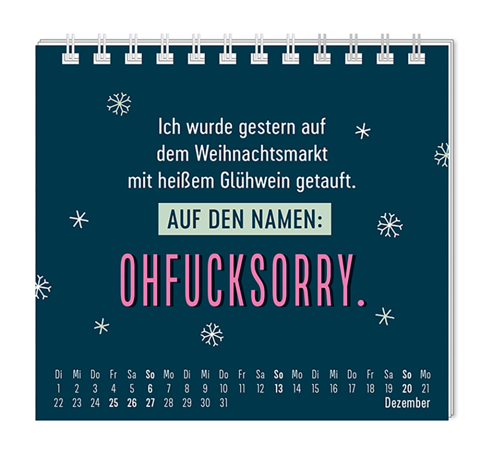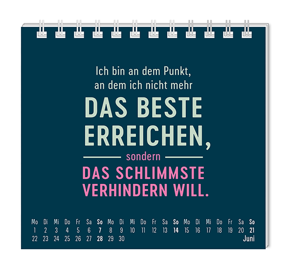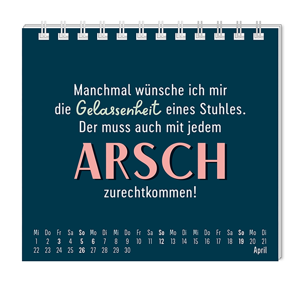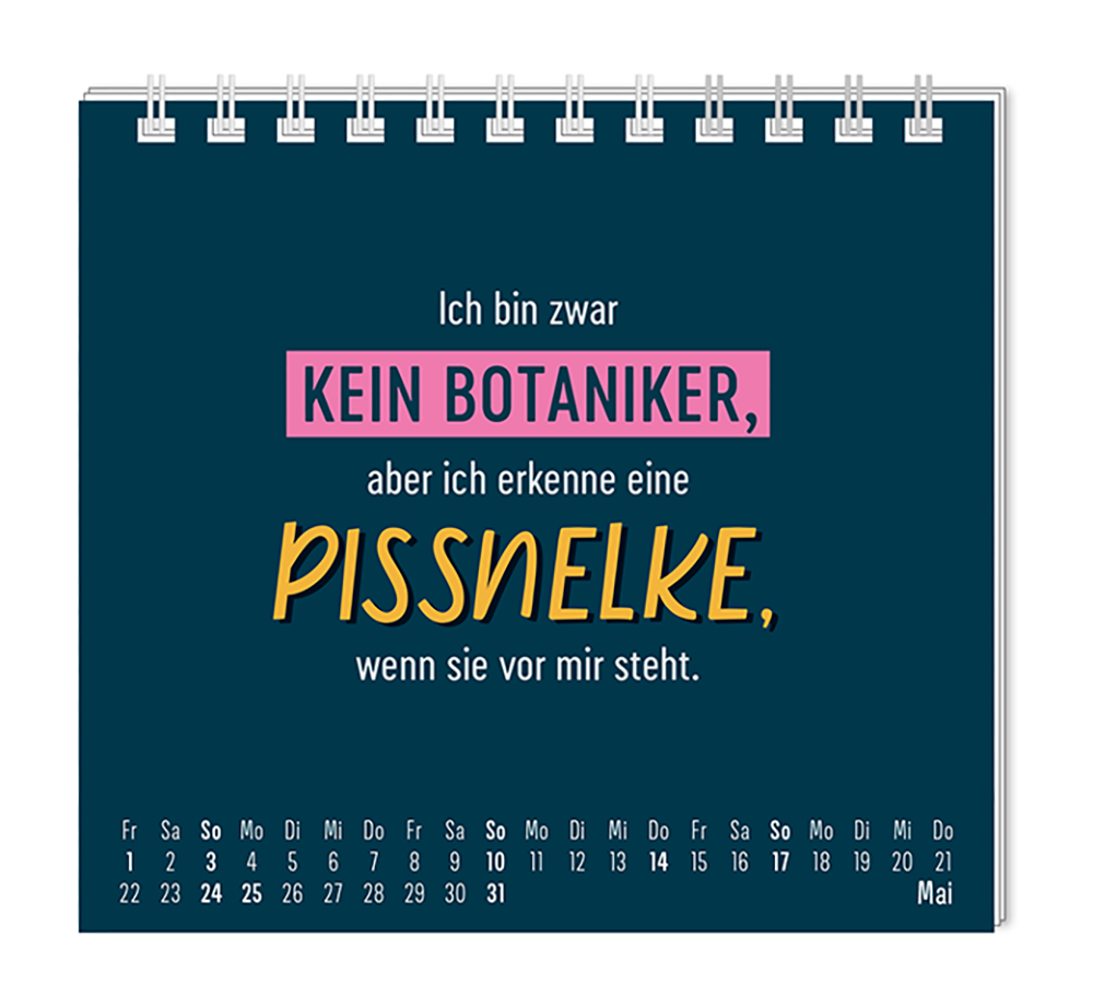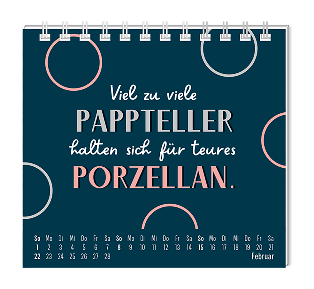Dieser kleine Tischkalender, versprüht Monat für Monat ganz viel Lebens- und Farbenfreude. Ob Vintage oder Wortschätzchen – jeder von unseren Mini-Kalender schenkt eine Extraportion Glück. Inklusive einer Jahresübersicht und der wichtigsten Feier- und Festtage.