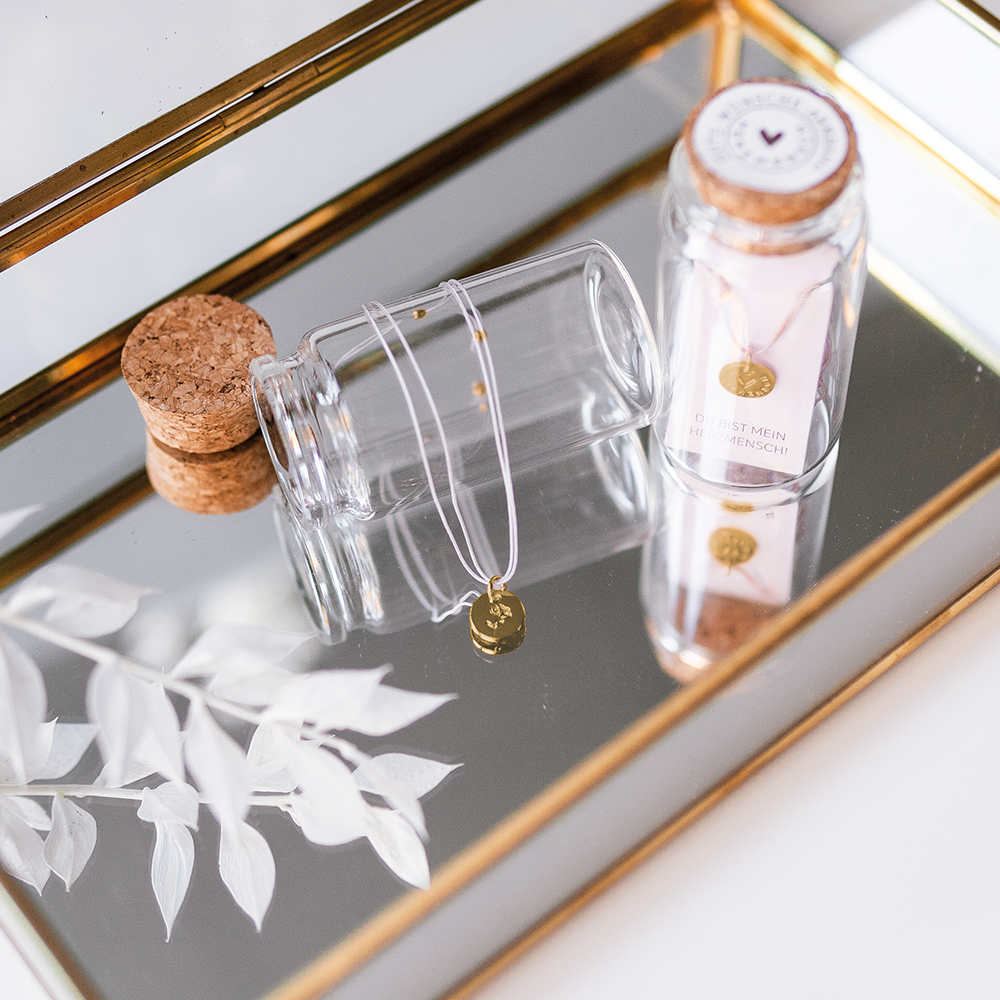 In diesem kleinen Fläschchen steckt ganz viel Herz. Das Gute-Wünsche Armband ziert ein gravierter Schmuckanhänger. Das farbige Band ist größenverstellbar und passt somit an jedes Handgelenk. Eine zauberhafte Geschenkidee von bleibendem Wert.