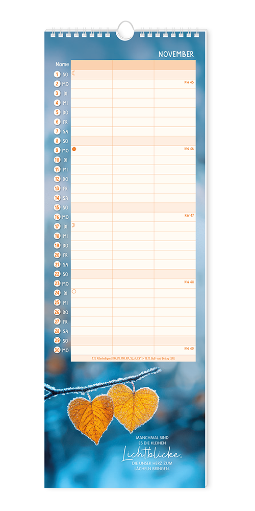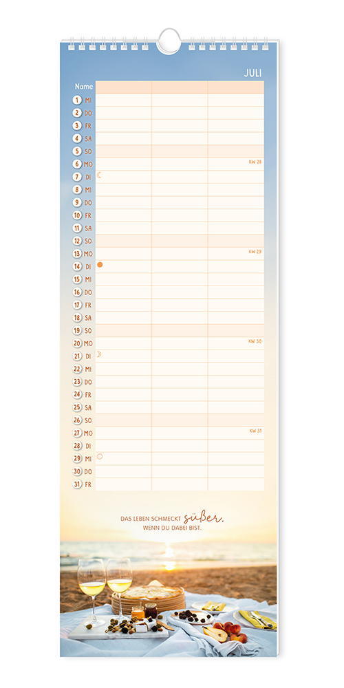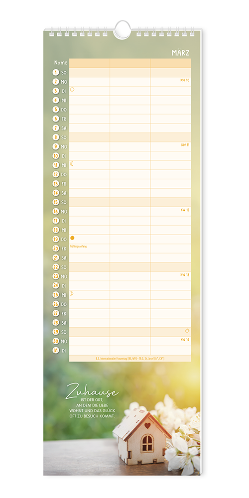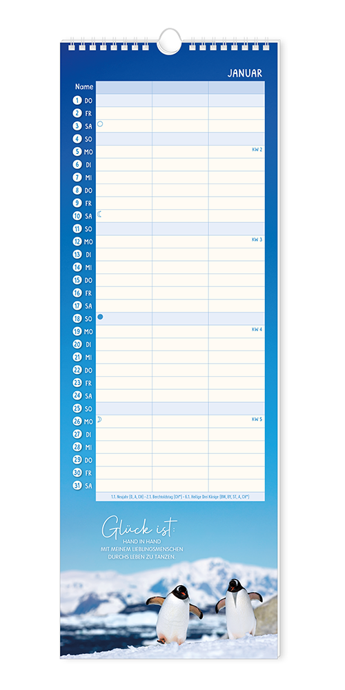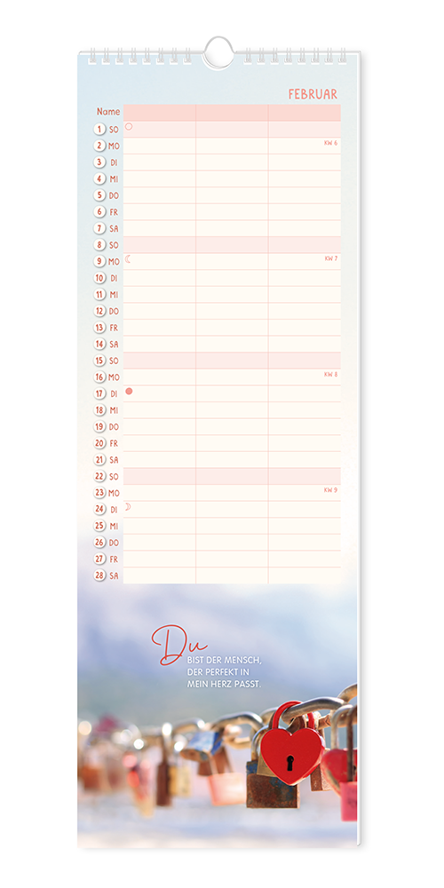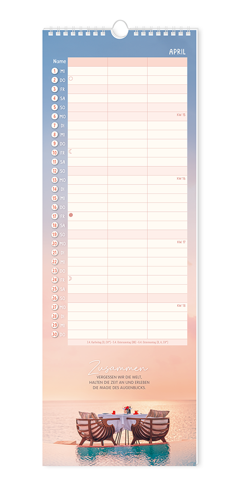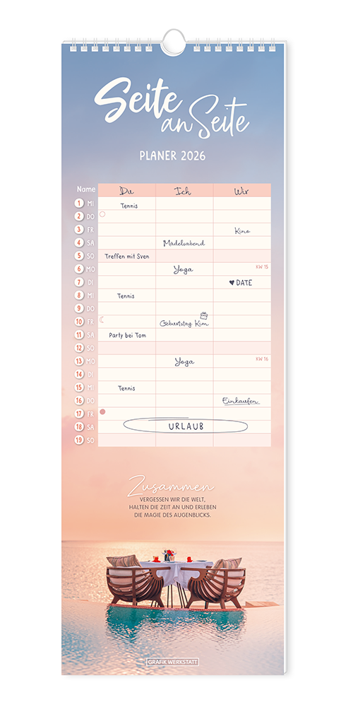 Mit diesem Planer organisiert sich das Zusammenleben zu zweit leichter: Jeder Partner bzw. Mitbewohner hat seine eigene Spalte für persönliche Eintragungen. Eine weitere Spalte bietet Platz für gemeinsame Termine und Unternehmungen.