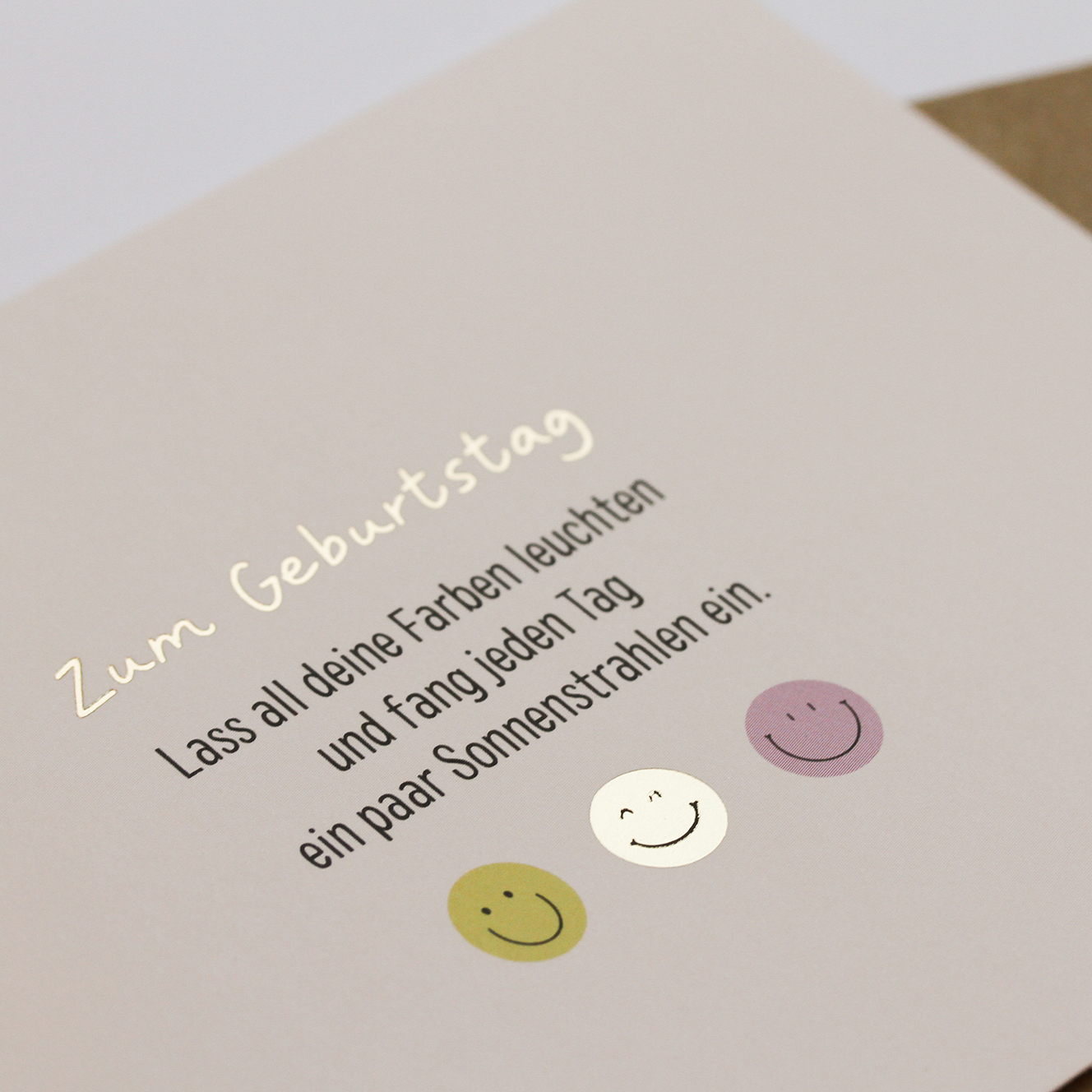Mit farbenfrohen Designs und heiteren Wortschätzchen schenkt diese neue Kollektion jede Menge „Happy Moments“. Für besonderen Glanz sorgen strahlende Goldveredelungen – so wird jede Klappkarte zum kleinen Blickfang. Trendige Packpapier-Umschläge bilden einen tollen Kontrast zu den bunten Motiven dieser ausdrucksstarken Serie.