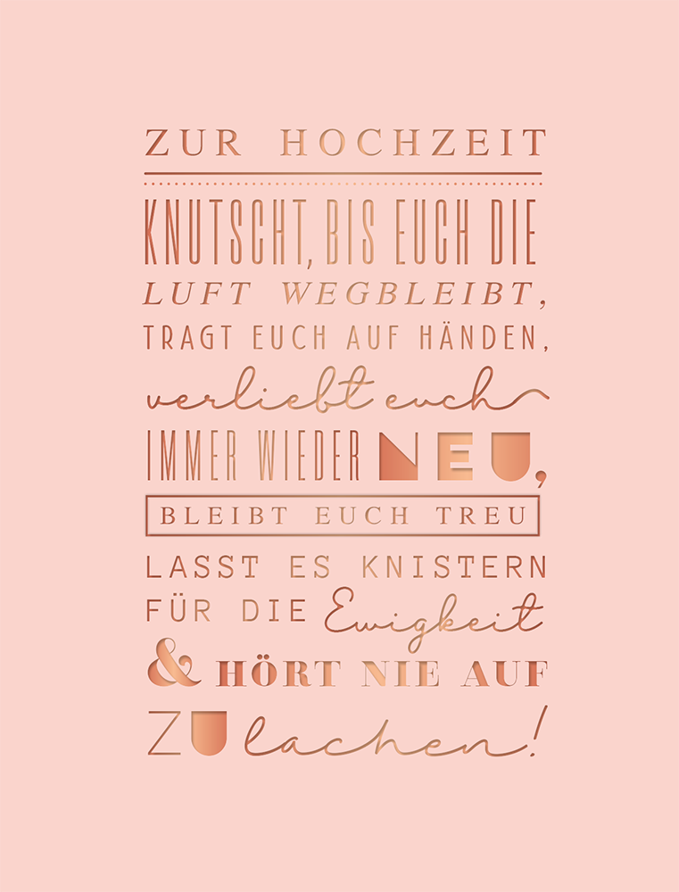 Knutsch, bis euch die Luft wegbleibt, tragt euch auf Händen, verliebt euch immer wieder neu, bleibt euch trau lasst es knistern für die Ewigkeit & hört nie auf zu lachen!