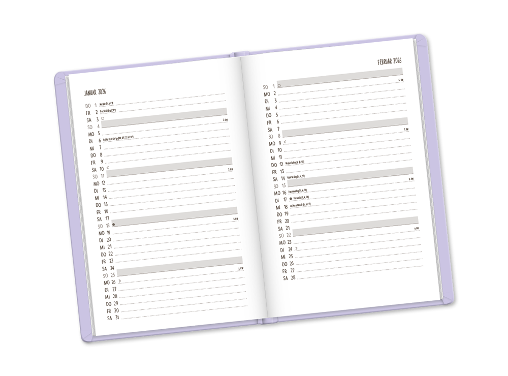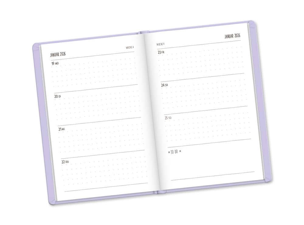 Diese Variante ist ein eleganter Begleiter durch das Jahr. Das edle Softcover im Lederlook ist fühlbar hochwertig verarbeitet und besonders unempfindlich. Filigran geprägte Ornamente zieren das Cover des attraktiven Terminplaners. Jede Kalenderwoche ist übersichtlich auf einer Doppelseite dargestellt. Außerdem bietet der Timer Platz für Notizen und all das, was Dir wichtig erscheint.